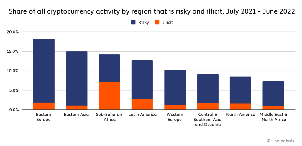 18.2% of cryptocurrency activity in the region is either “risky” or “illicit,” with Eastern Asia the next highest at 15% and Sub-Saharan Africa coming in third, though the latter had by far the largest share of illicit activity involving cryptocurrency.