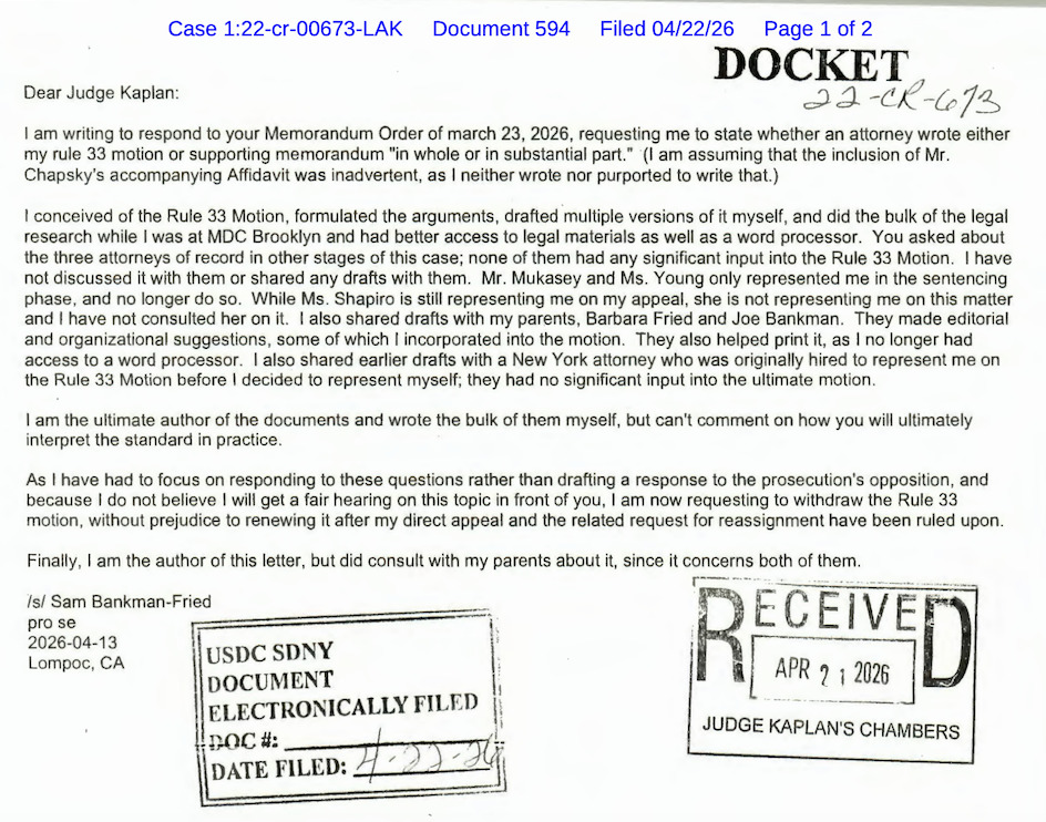In a Wednesday filing in the US District Court for the Southern District of New York, Bankman-Fried responded to a March 23 letter from Judge Lewis Kaplan ordering the former FTX CEO to answer whether he received any assistance from lawyers for a pro se motion — a filing on his own behalf without an attorney. Kaplan’s order followed US prosecutors raising doubts whether the convicted company founder filed for an extension of his request for a new trial by himself in March, just a few days after his mother, Barbara Fried, though lacking standing, sent a letter to the court on her son’s behalf.