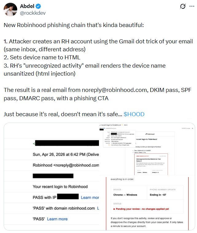 “The result is a real email from “noreply@robinhood.com” that passes SPF, DKIM, and DMARC. It looks completely legitimate but now contains injected fake warning text and a working phishing button. Clicking the button leads to a fake login site,” Eckelberry said.