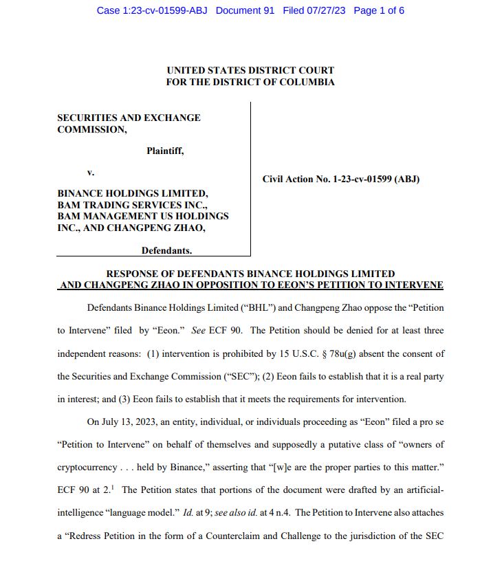 Therefore, both the plaintiff (SEC) and the defendants (Binance and CEO Changpeng “CZ” Zhao) are united in their opposition to any intervention by Eeon in the SEC’s lawsuit against Binance and its CEO.