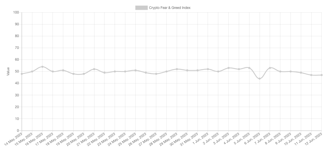 The Crypto Fear & Greed Index remains in “neutral” territory, having barely moved in recent weeks, hovering around the exact center of its 0-100 scale.