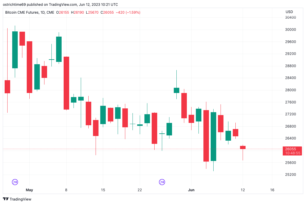 That gap stands between $26,150 and $26,500, with BTC/USD previously “filling” another within hours.