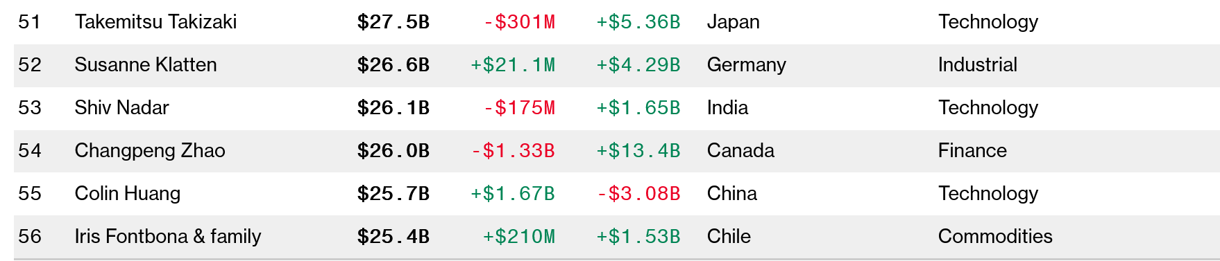 Zhao — the richest man in the crypto industry and the 54th richest person overall — had his net worth fall 5.1% to $26 billion this week.