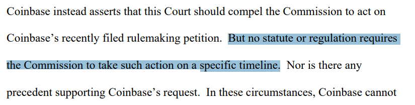 Today the SEC responded to Coinbase’s petition for a writ of mandamus — asking the court to require the SEC to respond just yes or no to whether it will undertake rulemaking for our industry. The SEC’s answer? A resounding maybe. 1/7