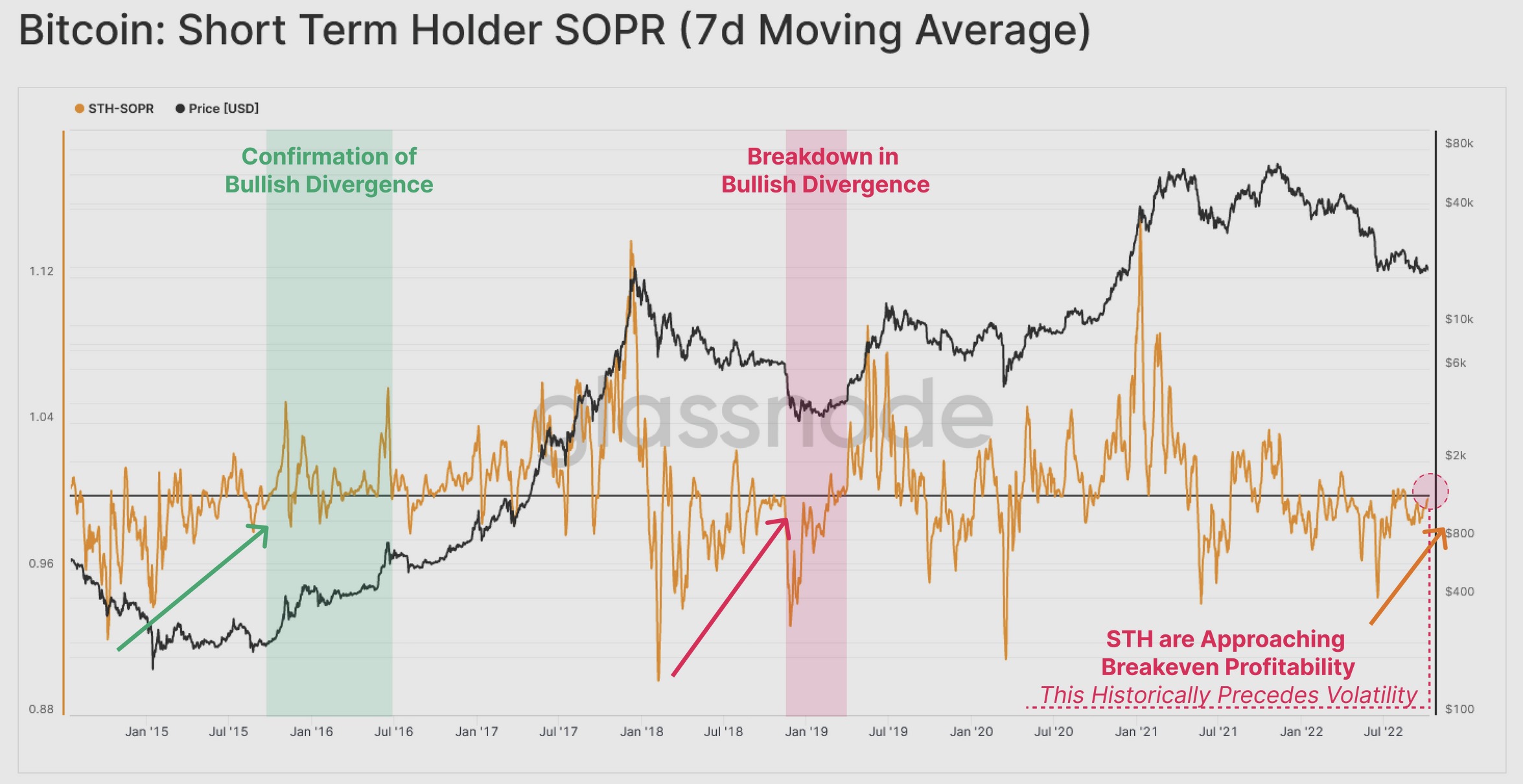 In addition to the divergence between the price and the adjusted SOPR, short-term Bitcoin holders are approaching their breakeven level as the short-term holder SOPR approaches 1.0.