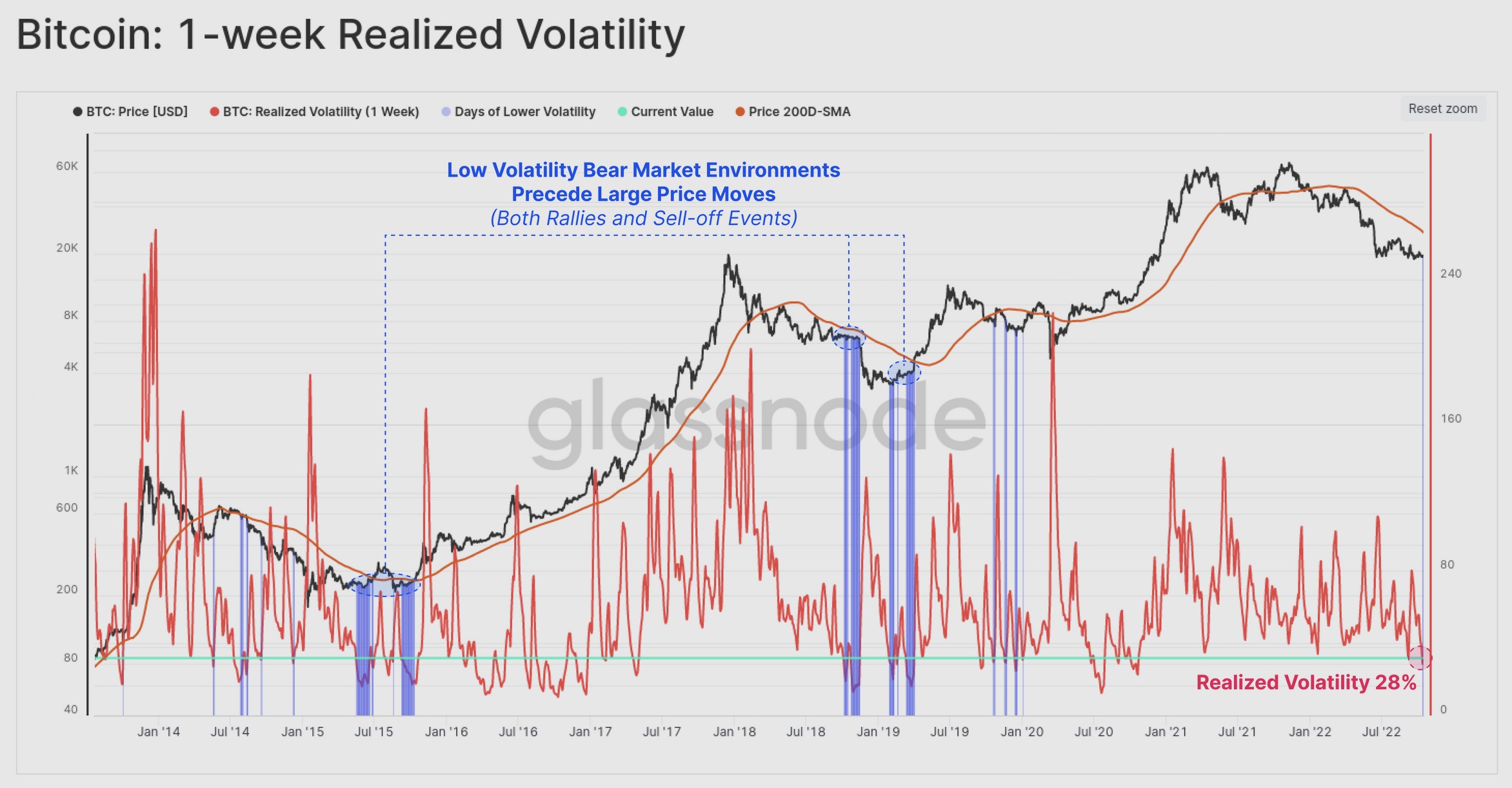 According to Glassnode research, the “Bitcoin market is primed for volatility,” with on- and off-chain data flashing multiple signals. The researchers note that 1-week realized volatility has fallen to 28%, a level that is typically followed by a sharp price move.