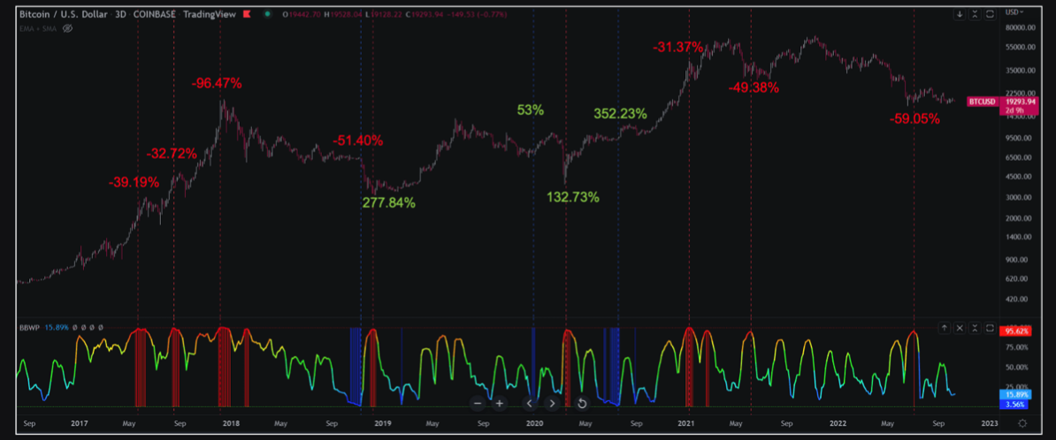 On Oct. 10, Delphi Digital researchers referenced the Bollinger Band Width Percentile (BBWP) metric and suggested the possibility of “a big move brewing for BTC.” The researchers explained that “historically, BBWP readings above 90 or below 5 have marked major swing points.”