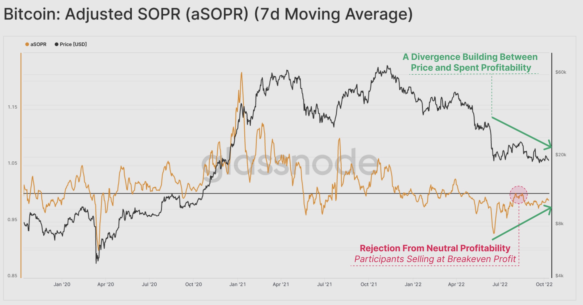 “A large divergence is currently forming between price action, and the aSOPR metric. As prices trade sideways or decline, the magnitude of losses that being locked in are diminishing, indicating an exhaustion of sellers within the current price range.”