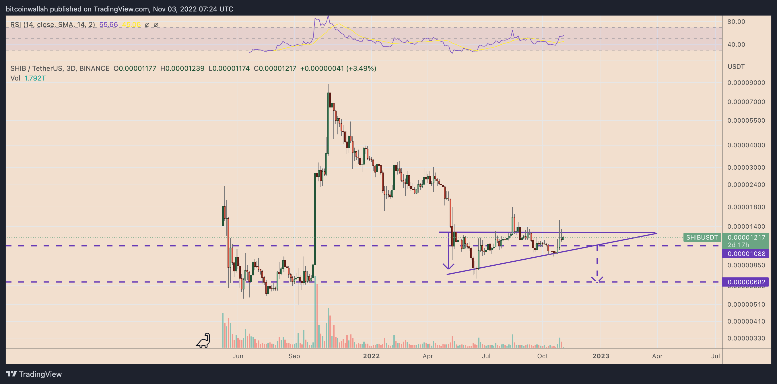 Nevertheless, the SHIB/USDT pair still risks a 10%-15% short-term price correction to $0.00001088 based on its recent fluctuations inside an ascending triangle range, as shown below.