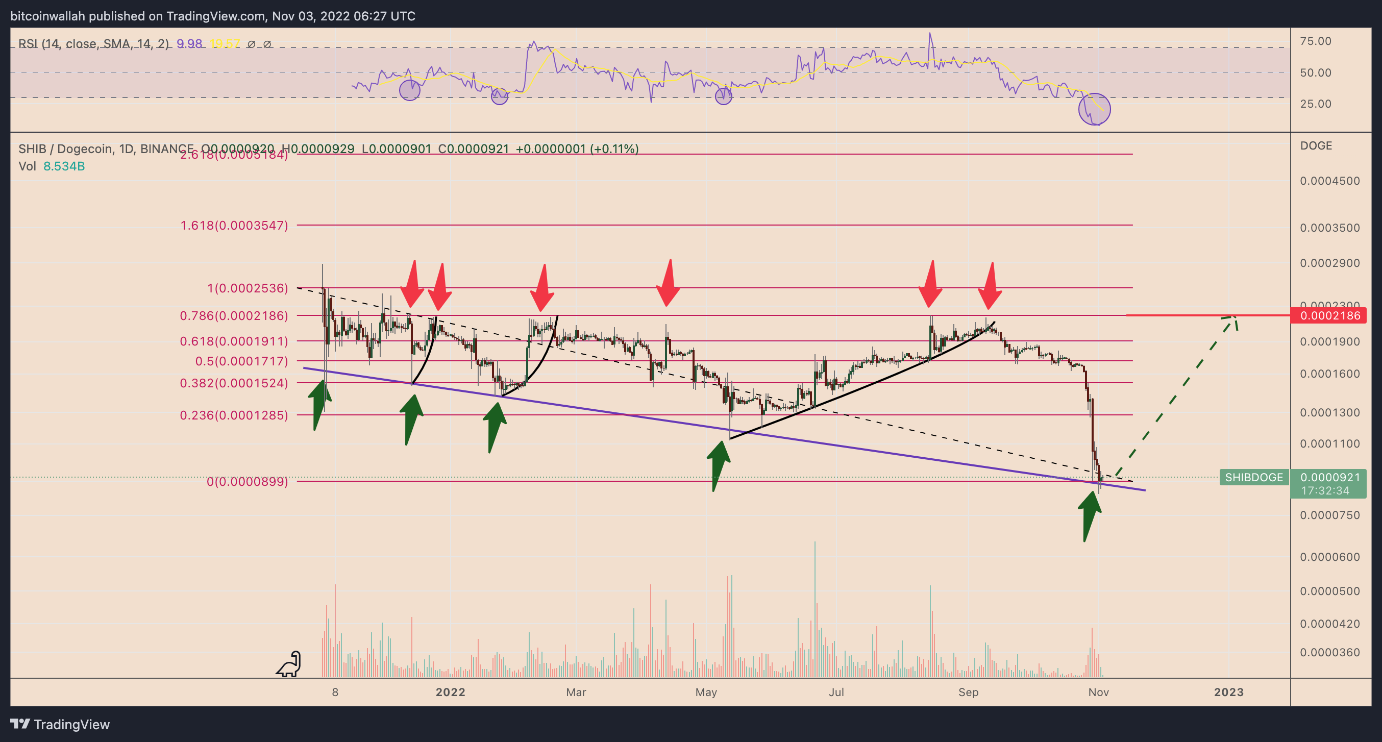 Interestingly, all the SHIB/DOGE’s rebound moves reached the 0.0002186-0.0002536 range as their primary upside targets. This area coincides with the pair’s 0.786-1 Fib line range, derived from the Fibonacci retracement graph drawn from the 0.0002536 swing high to the 0.0000899 swing low, as shown in the chart below.