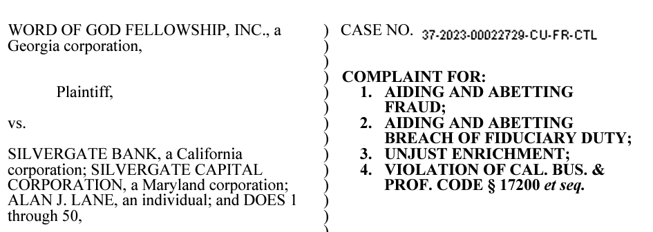 In May, the Texas-based Word of God Church also sued the bank alleging it used $25 million of church deposits to participate in FTX’s “fraudulent” scheme, adding Silvergate and Lane had “unparalleled knowledge of the rampant fraud and corporate malfeasance.”