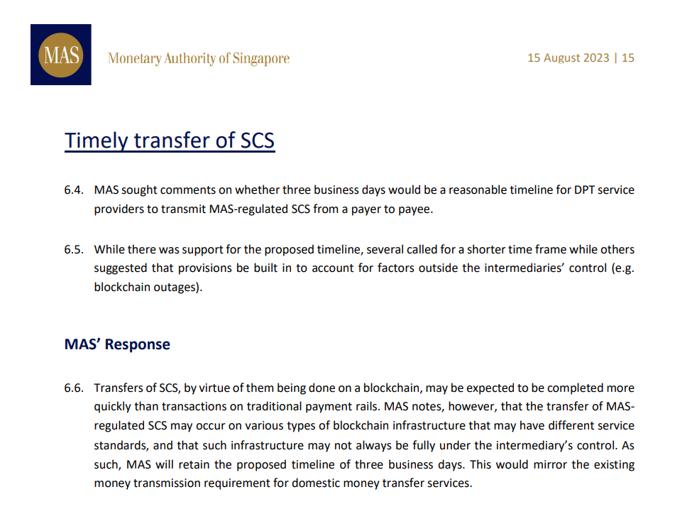 “MAS will retain the proposed timeline of three business days. This would mirror the existing money transmission requirement for domestic money transfer services.”