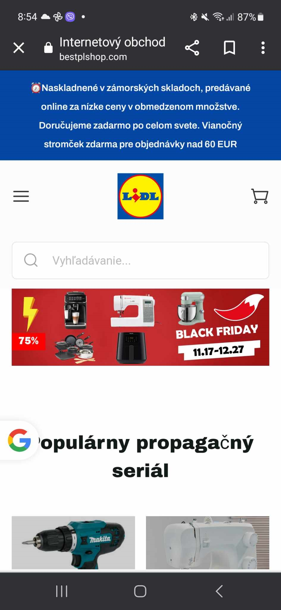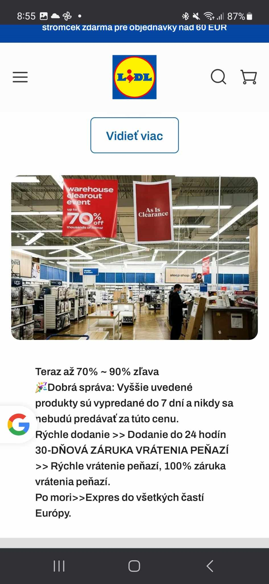Vizuálne prevedenie podvodného eshopu pripomína online trhovisko Lidlu, pričom v hornej časti stránky sa aj zobrazuje logo obľúbeného obchodného reťazca. Pozorný zákazník si však všimne, že doména stránky je podozrivá.
