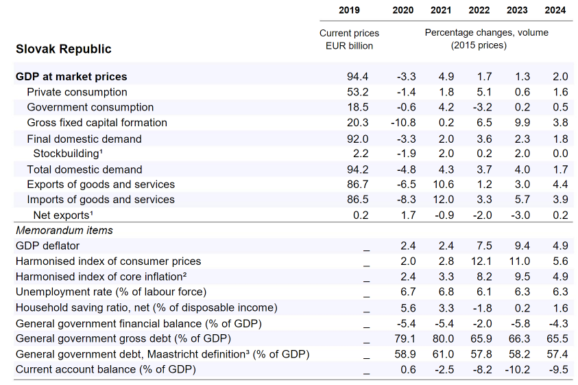Na základe správy OECD očakáva rast HDP v roku 2023 na úrovni 1,3%, zatiaľ čo v roku 2024 na hodnote 2%. Rast investícii má byť stimulovaný čerpaním eurofondov a má podporiť rýchlejšie tempo rastu ekonomiky. Oživenie svetového dopytu a obnovenie dodávateľských reťazcov má Slovensku od roku 2024 pomôcť zvýšiť export.