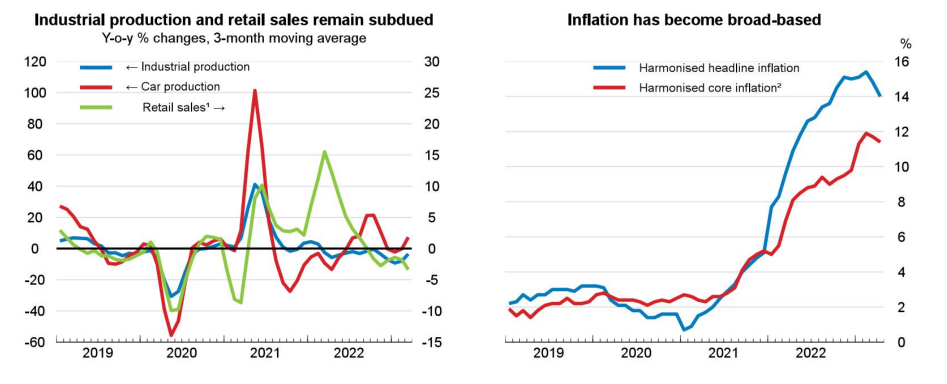 Rast v roku 2023 by mal byť riadený predovšetkým investíciami. Rovnako majú stúpať aj reálne mzdy, ktoré potlačia vplyv vysokej inflácie na spotrebu. Pokles inflácie by mal pokračovať aj v druhej polovici roku 2023 z dôvodu zníženia cien energií a jedla na globálnych trhoch, zatiaľ čo jadrová inflácia klesne pomalšie z dôvodu oneskoreného znižovania cien ďalších tovarov.