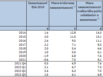 Ako vidíme na tabuľke nižšie, miera nezamestnanosti sa v treťom kvartáli 2022 pohybovala na Slovensku na úrovni 6,1 %. Zároveň miera nezamestnanosti z celkového počtu uchádzačov o zamestnanie sa pohybuje na úrovni 6,8 %.