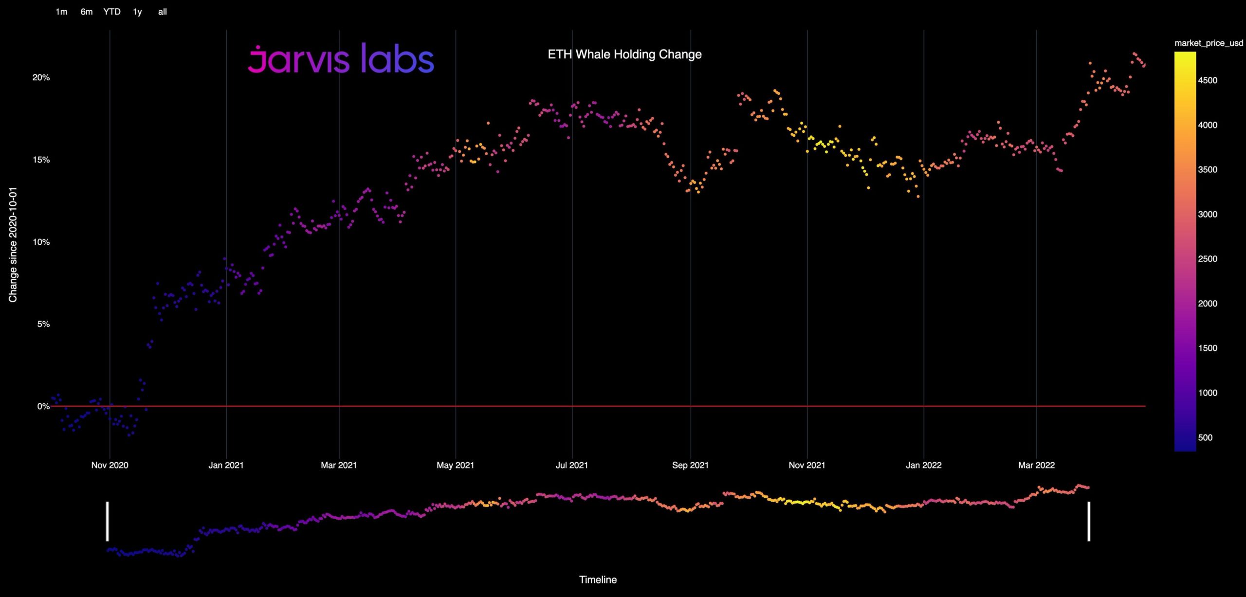 A deeper dive into the ongoing accumulation of Ether by whale wallets was provided by cryptocurrency intelligence firm Jarvis Labs, which posted the following chart looking at the percentage change in whale wallet holdings versus ET price.