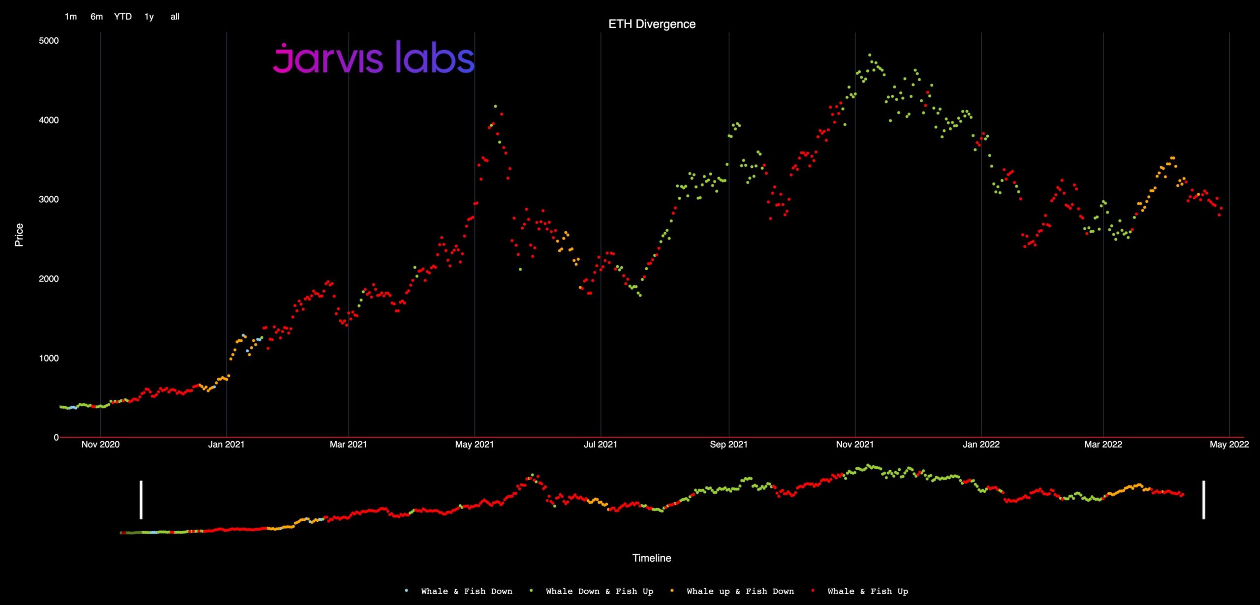 The color of the dots relates to the price of Ether, with the chart showing that whale wallets began decreasing their holdings when the price was above $4,000 and they didn’t start to reaccumulate until after the price dropped below $2,300.
