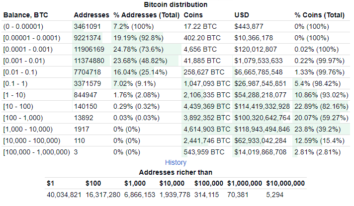 V súčasnosti je podľa CoinMarketCap vyťažených 19 394 343 BTC z celkového počtu 21 miliónov. Ostáva už iba 8 % mincí, ktoré nájdu svojho nového majiteľa a vyťažia sa. Tempo emisie nových mincí je ale každým cyklom pomalšie o polovicu a preto potrvá ešte dlhé desaťročia, kým sa vyťaží posledný bitcoin. Na základe údajov od Bitinfocharts však vieme určiť rozdelenie bohatstva na bitcoinovej sieti.
