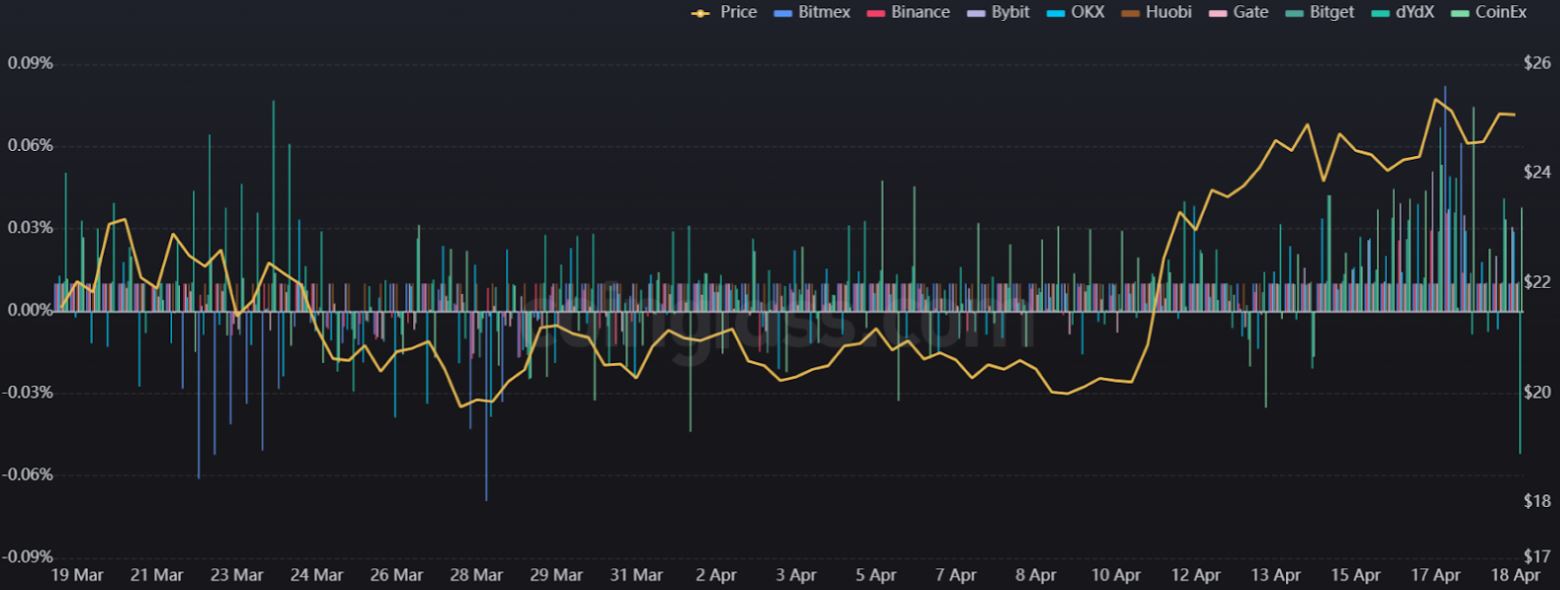 The developments along with bullishness in the broader market, boosted the price of SOL by 29.05% from April 11 to a monthly high of $26.03.