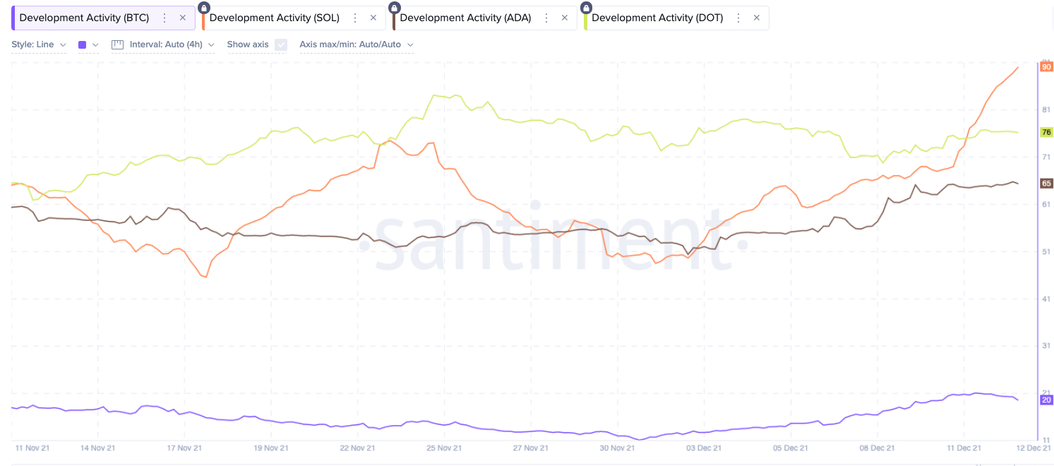As per Santiment data, Solana surpassed the daily GitHub submission rates of Polkadot and Cardano to become the leading blockchain over the past month. The number of daily GitHub submissions for Solana reached 90 between Nov. 12 and Dec. 13, followed by Polkadot at 76, and Cardano at 65.