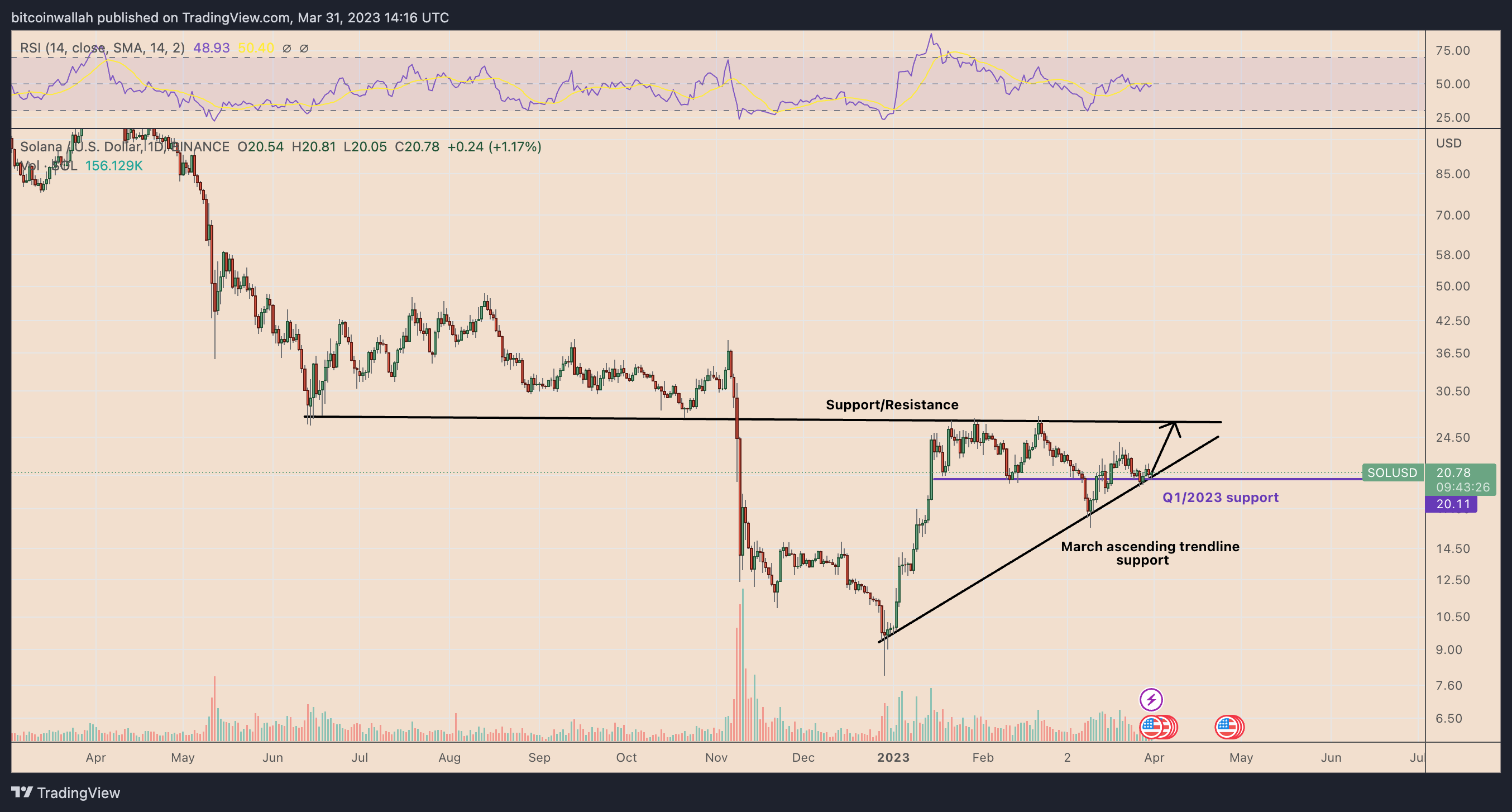 Nevertheless, as of March 31, Solana trades above two technical support levels: a horizontal trendline that has capped SOL’s downside attempts mostly throughout Q1/2023 and an ascending trendline that served as backup support in early March when the horizontal one failed.