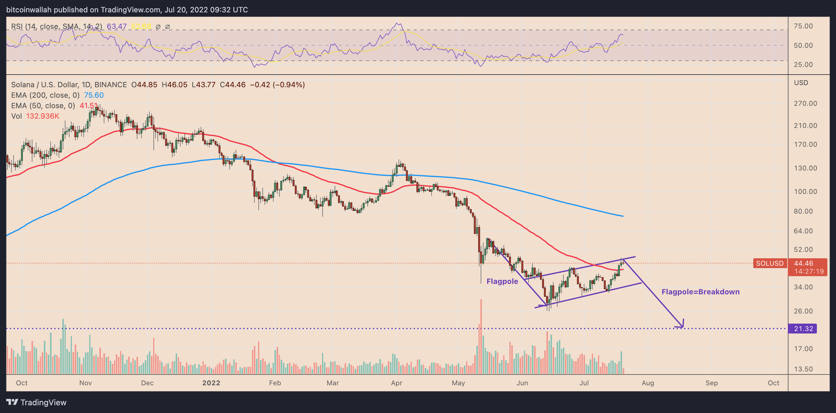 The bear flag setup appears after SOL’s 80%-plus price rally since June 14, primarily driven by a similar recovery across the crypto market.