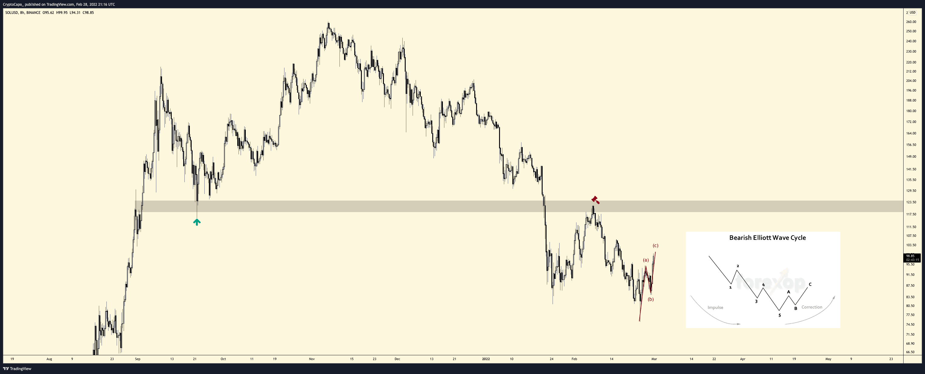 The pseudonymous analyst presented $120, the double-bottom neckline, as a solid resistance level that would most likely limit SOL’s ongoing upside retracement. He also applied the popular Elliott Wave Theory to hint about the beginning of Solana’s next bearish wave cycle, as tagged with “c” in the chart below.
