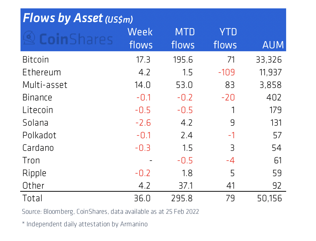 In contrast, all the digital asset investment products combined attracted $36 million in the same period, with multi-asset portfolios injecting the highest capital — of $14 million, followed by Bitcoin’s 17.3 million.