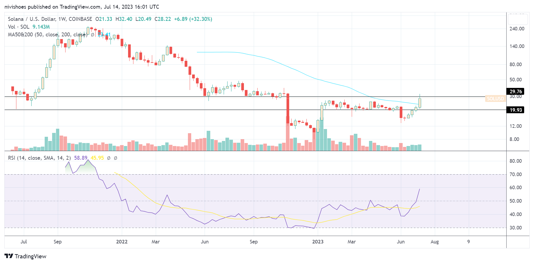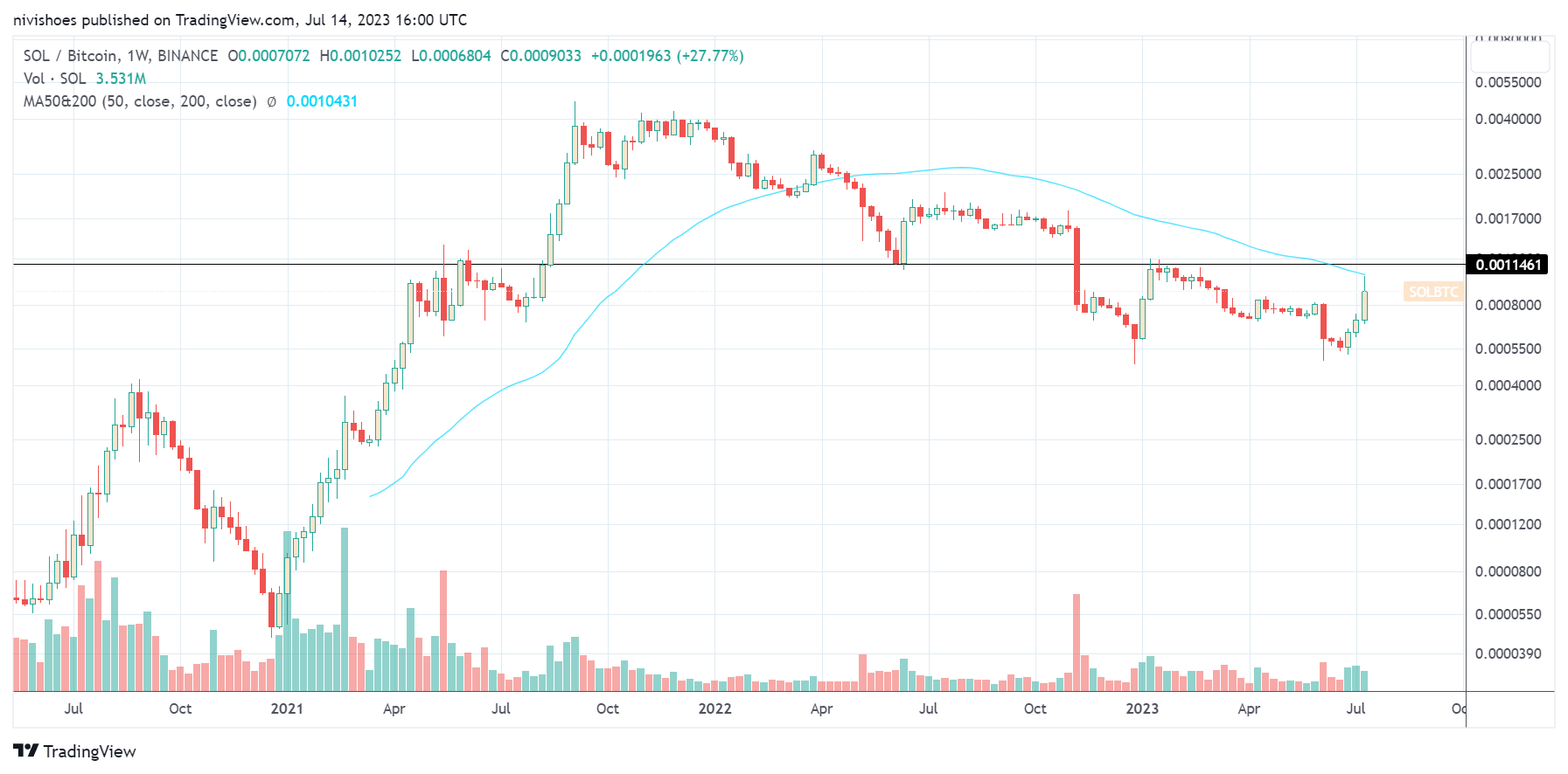 The SOL/BTC pair faces resistance from the yearly peak level around 0.00114 BTC. The 50-day weekly moving average at 0.00104 BTC level also appears to be acting as a crucial resistance as its price peaked exactly at this point on June 14.