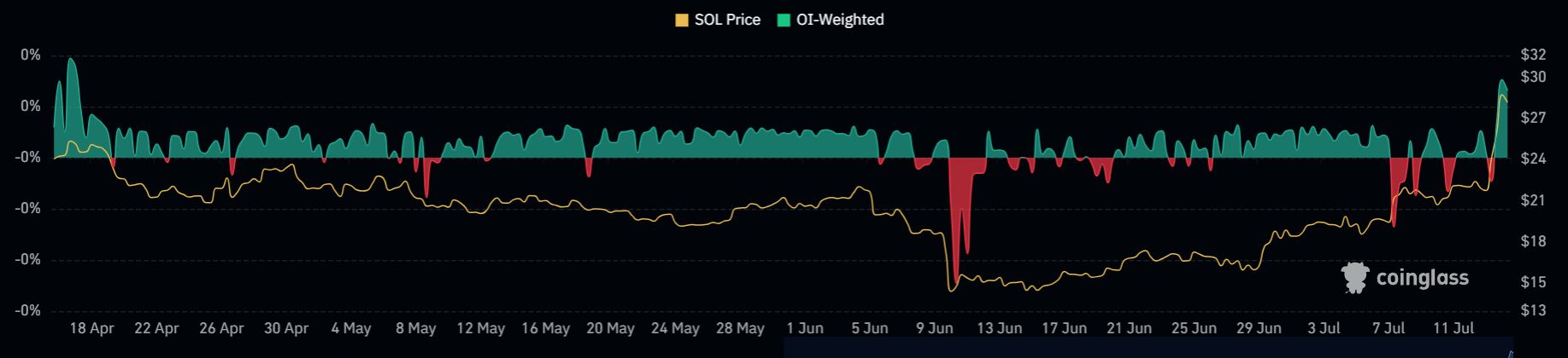 The funding rate for SOL perpetual swap contracts, which reflects the sentiment of perpetual traders towards an asset, surged to a two-month high. This indicates that many traders opened long positions following the positive breakout on June 14, driven by fear of missing out (FOMO) sentiments.