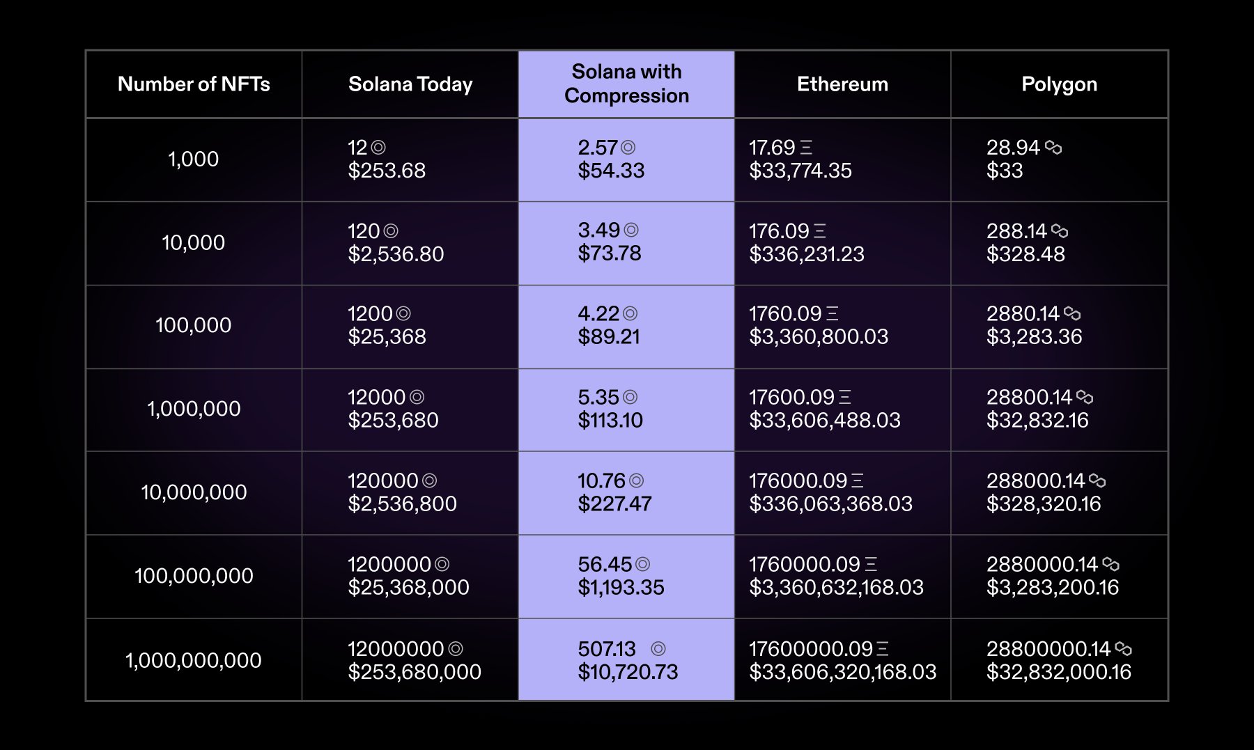 Layer-1 blockchain Solana has released a new solution aiming to drastically reduce the cost of on-chain storage. Called state compression, the technology promises to bring down the cost of minting 1 million nonfungible tokens (NFTs) on the network to nearly $110.