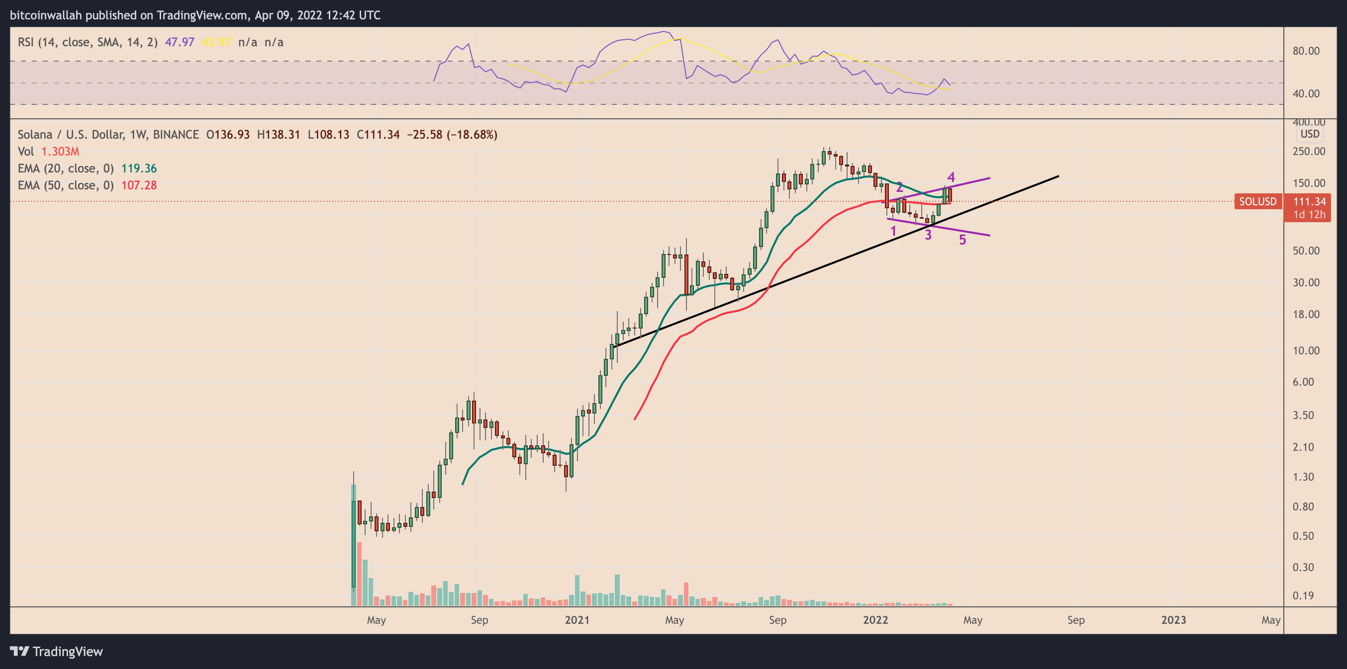 SOL has been sketching a similar pattern since the beginning of 2022, with the coin undergoing a pullback after testing the megaphone’s upper trendline near $140 as resistance — the fourth wing.