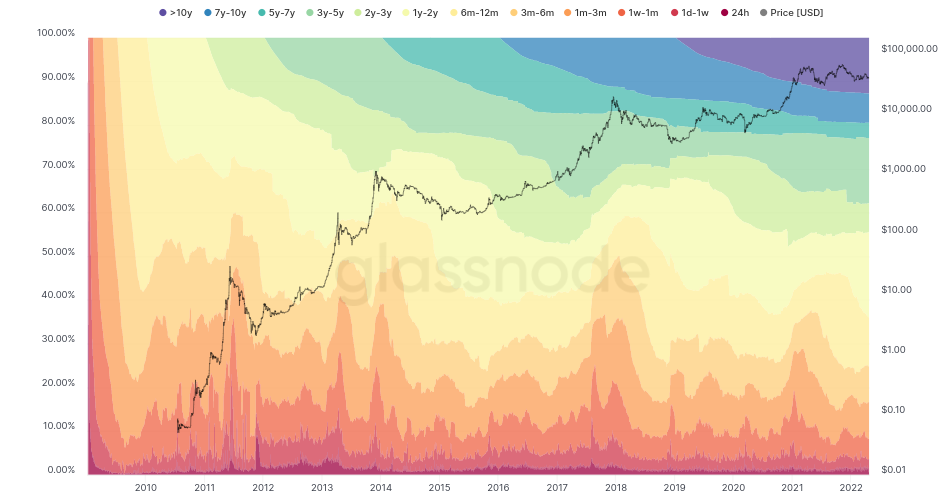 HODL Waves, a Glassnode indicator showing hodled coins of all ages, meanwhile confirms the trend. Since December 2021, the 1-2 year supply slice has increased more than any other — from under 10% then to nearly 15% as of this week.
