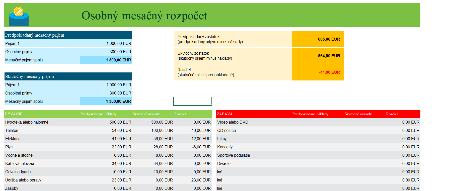 Všetky položky v zelenom sú tvoje hlavné, ktoré by si prioritne mal každý mesiac zabezpečiť, aby boli uhradené. Potom, ako bolo spomenuté, tvoj cieľ by mal byť ušetriť na položkách, ktoré máš napríklad žltou farbou, ako dôležité, ale nie prioritné. Napríklad dovolenky. Má zmysel sa zamyslieť, či sa nedá ušetriť a dovolenku si urobiť výnimočne tento rok na Slovensku. Peniaze si odložíš na horšie časy.