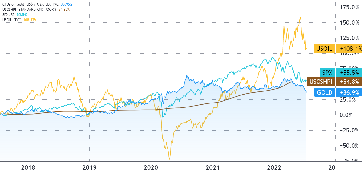 From July 2017 until July 2022, gold has underperformed the remaining asset classes by 18% or higher. The precious metal broke above $2,000 in August 2020, but it could not keep up with the ever-growing prices of stocks, housing and energy. In comparison, the United States monetary base, bank deposits and cash, expanded by 48.5% in the same period.