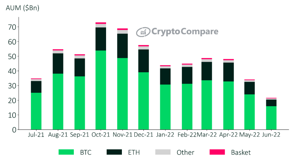 According to CryptoCompare, the Bitcoin investment vehicles under management (AUM) totaled $15.9 billion in June. This metric includes exchange-traded products such as Grayscale GBTC and exchange-traded notes from multiple providers. This ratio is equivalent to 4% of Bitcoin’s current $400 million market capitalization.