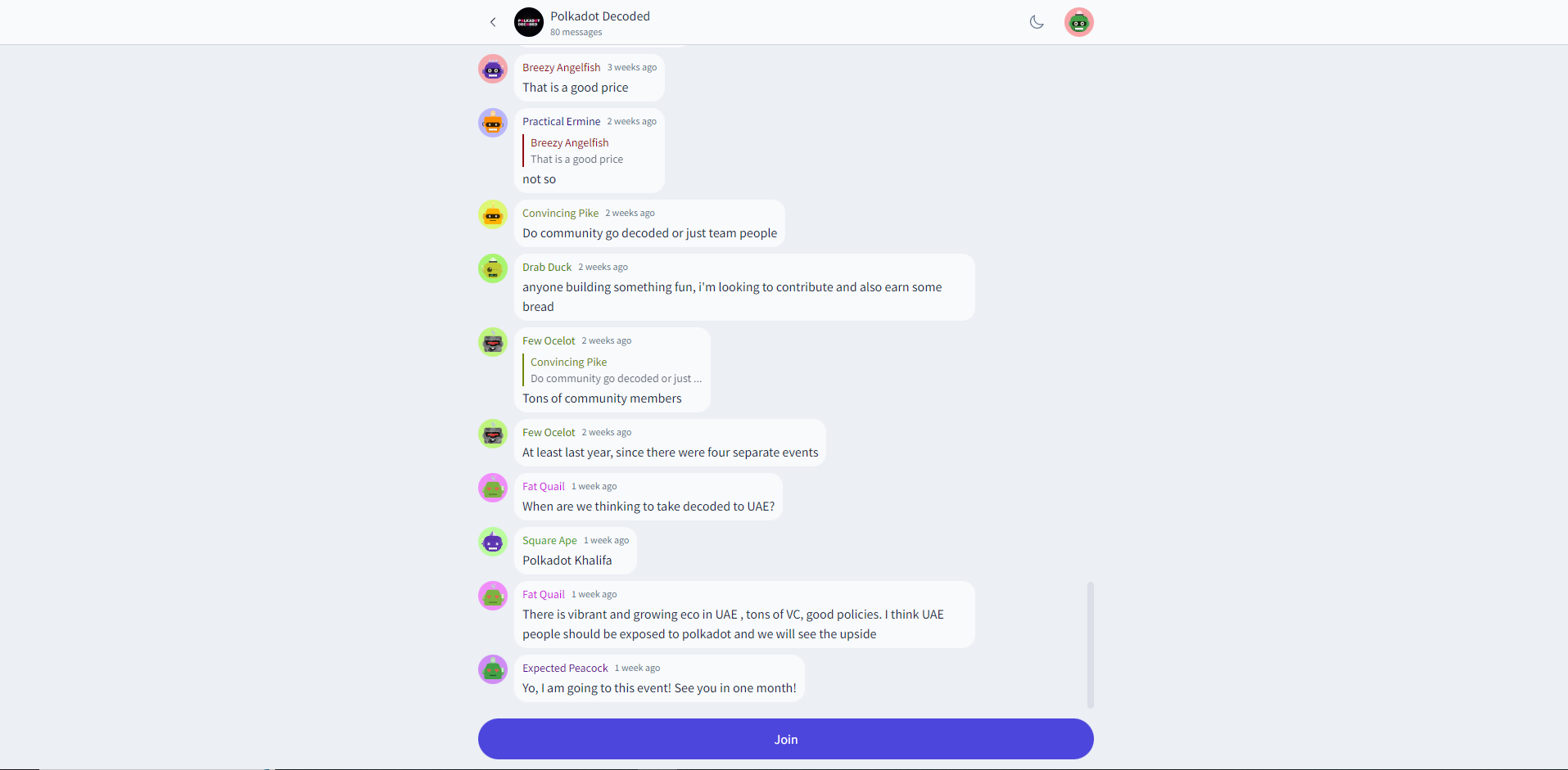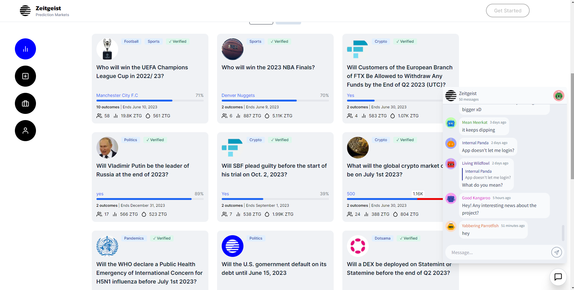 By contrast, chat groups on Grill.chat can be integrated into a development team’s website or application interface. Edwards pointed to the example of Zeitgeist, a blockchain-based predictions market app. Its interface features a “chat” icon that opens directly into a Zeitgeist chat room on Grill.chat.