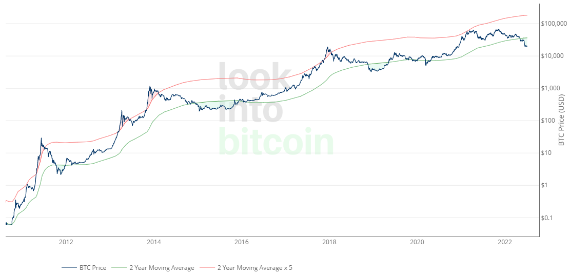 The green shaded areas on the chart represent periods of time where the price of Bitcoin is at a level that is considered historically low and may represent a good opportunity to buy.