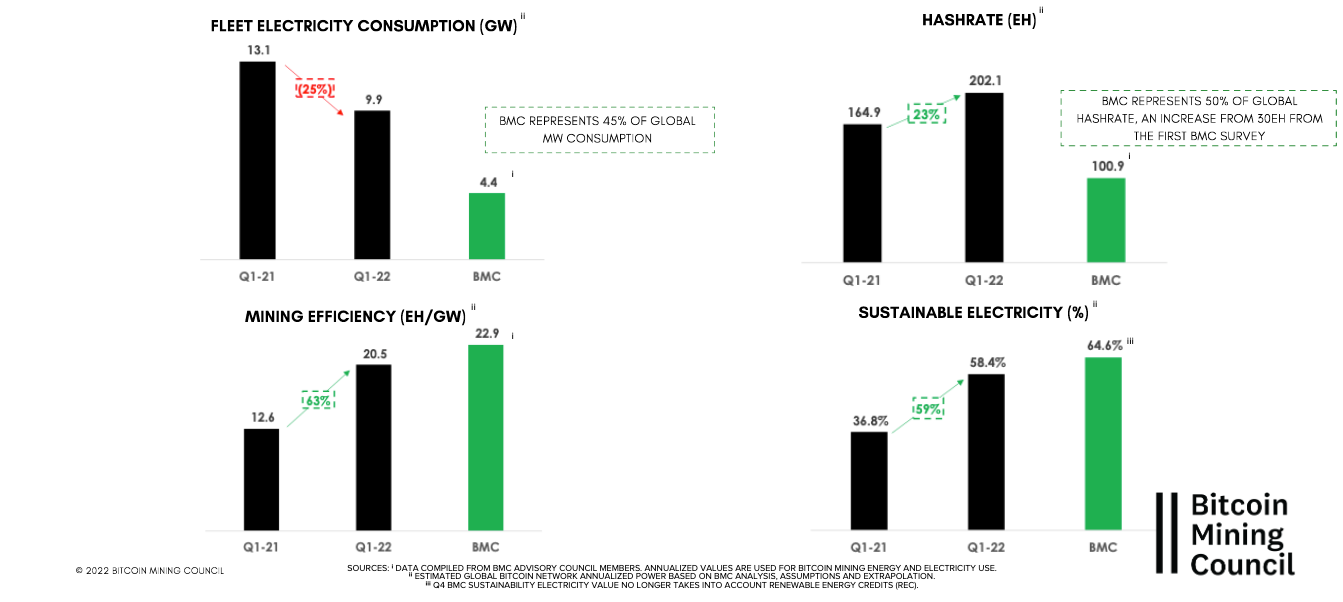Over the past 12 months electricity consumption by the industry decreased by 25%, whilst the hash rate increased by 23% from 164.9 to 202.1, equaling a 63% increase of mining efficiency in the last year since Q1 2021. The BMC alleges Bitcoin mining is 5,814% more efficient than it was eight years ago.