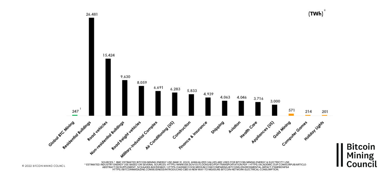 The report breaks down the total estimated energy usage by industry, alleging that global Bitcoin mining operations use 247 terawatt-hours (TWh), less than half of what gold mining operations consume, and 0.16% when compared to the world’s total energy usage.