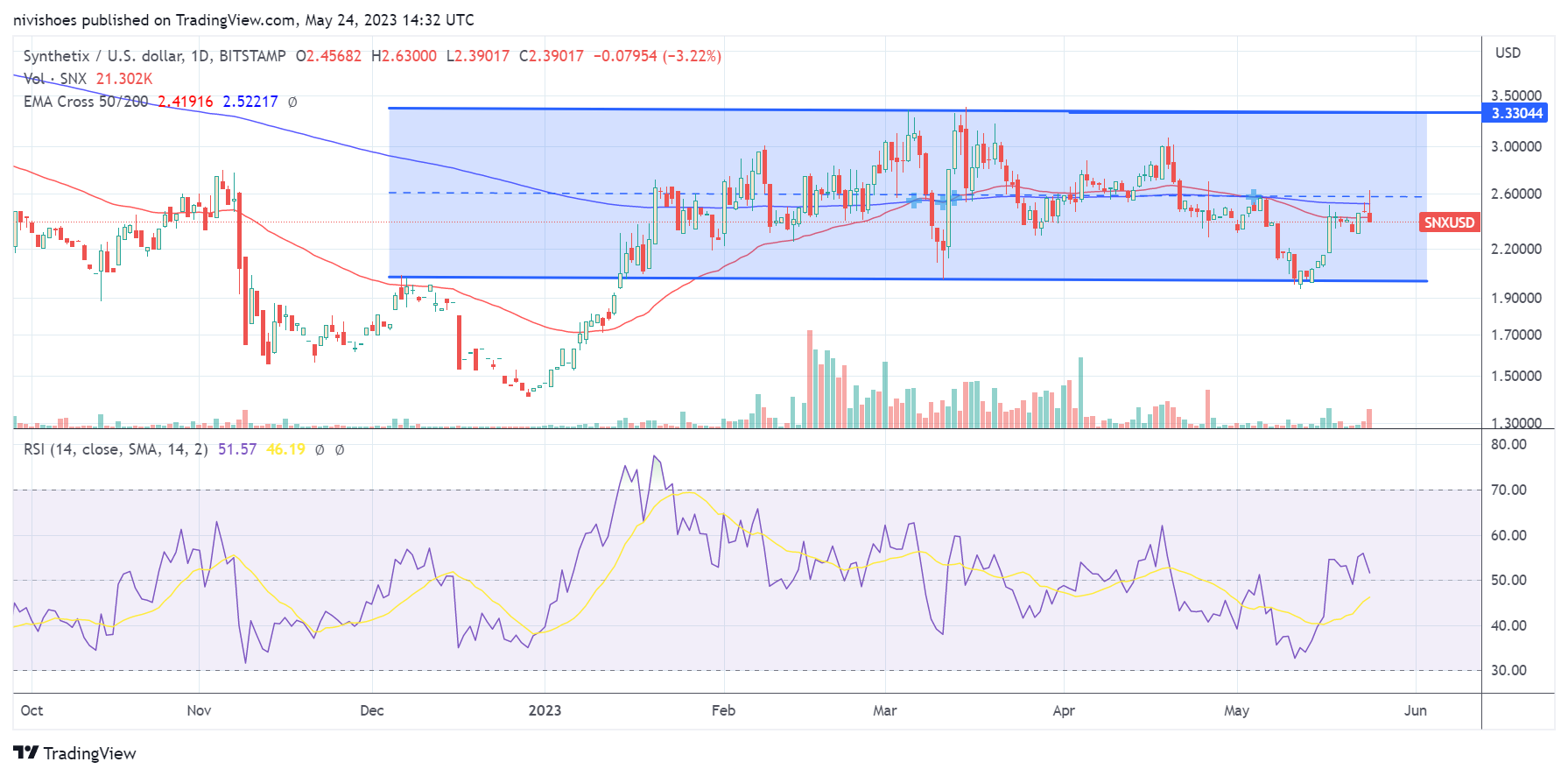 Technical analysis of the SNX/USD pair shows that it has encountered resistance at around $2.50, which is the midpoint of the pair’s parallel range this year and where its 50- and 200-period exponential moving averages (EMA) are trending.