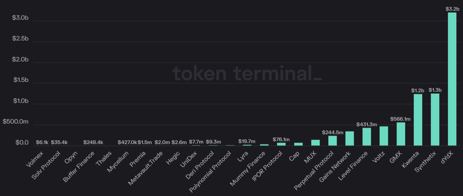 The ratio of trading to OI volumes in a weekly timeframe for dYdX is around 16, for GMX around 3.77 and for Synthetix’s Kwenta at 26.