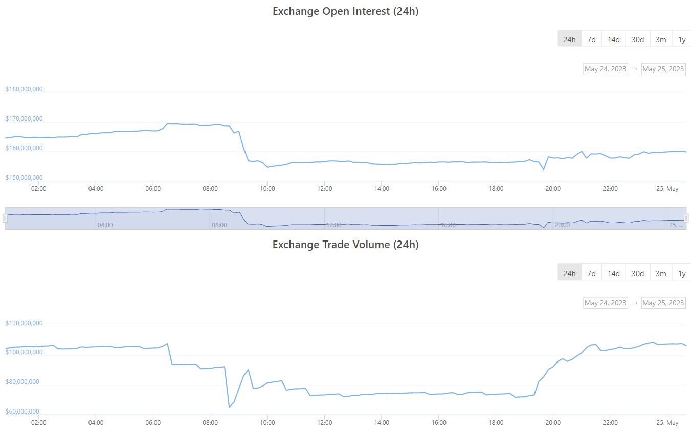Similar to GMX, dYdX OI volumes have stayed flat, but trading volumes have declined in May. The DYDX token also dropped by 7.53% on May 24 alongside GMX, losing support below the 200-day moving average at $2.10.