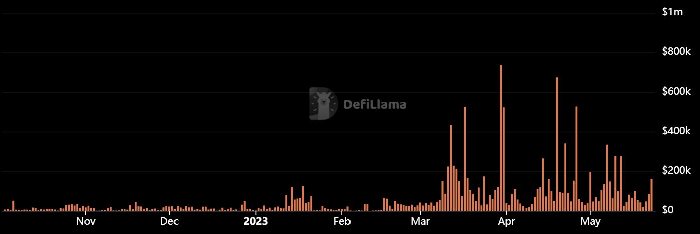 Notably, GMX OI and trading volumes have declined in May 2023, potentially due to a lack of volatility in Bitcoin and Ethereum prices.