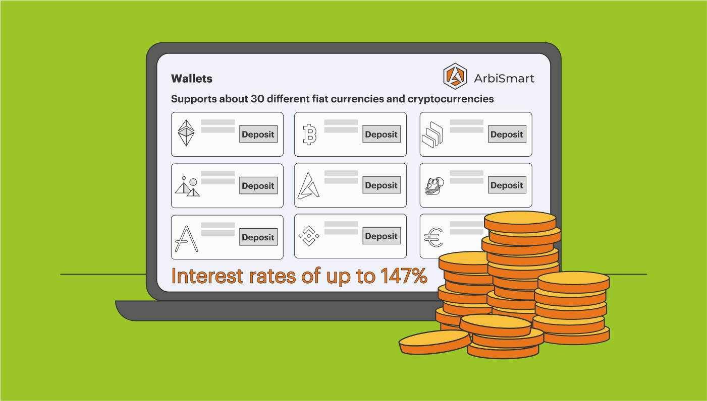 Autorizovaná peňaženka na generovanie úrokov ArbiSmart EU ponúka úložisko pre 30 rôznych FIAT a kryptomien. Za uzamknutie finančných prostriedkov v sporiacom pláne môžete získať až 147 % pasívnych ziskov ročne. Presná výška úrokov, ktoré získate, závisí od úrovne vášho účtu, ako aj od meny a trvania zmluvy o sporiacom pláne, ktorá môže byť krátka ako mesiac alebo dlhá ako 5 rokov.