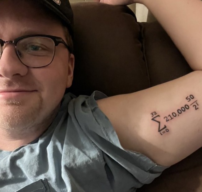 The tattoo on his bicep is a common (but unfortunately not strictly accurate) formula for the supply of Bitcoin. He shared a warning with readers: “The bottom of the Sigma might be the most painful thing I ever experienced. Just a forewarning.”