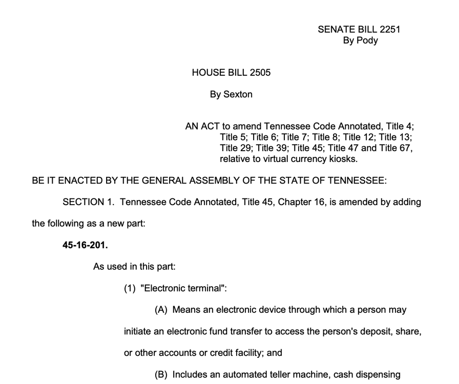 Lee signed Tennessee House Bill 2505 into law on April 13, making the installation of a cryptocurrency kiosk a Class A misdemeanor starting on July 1. The reclassification of the machines as illegal under state law would potentially put operators and businesses hosting the machines at risk of up to 11 months and 29 days in prison and a $2,500 fine.