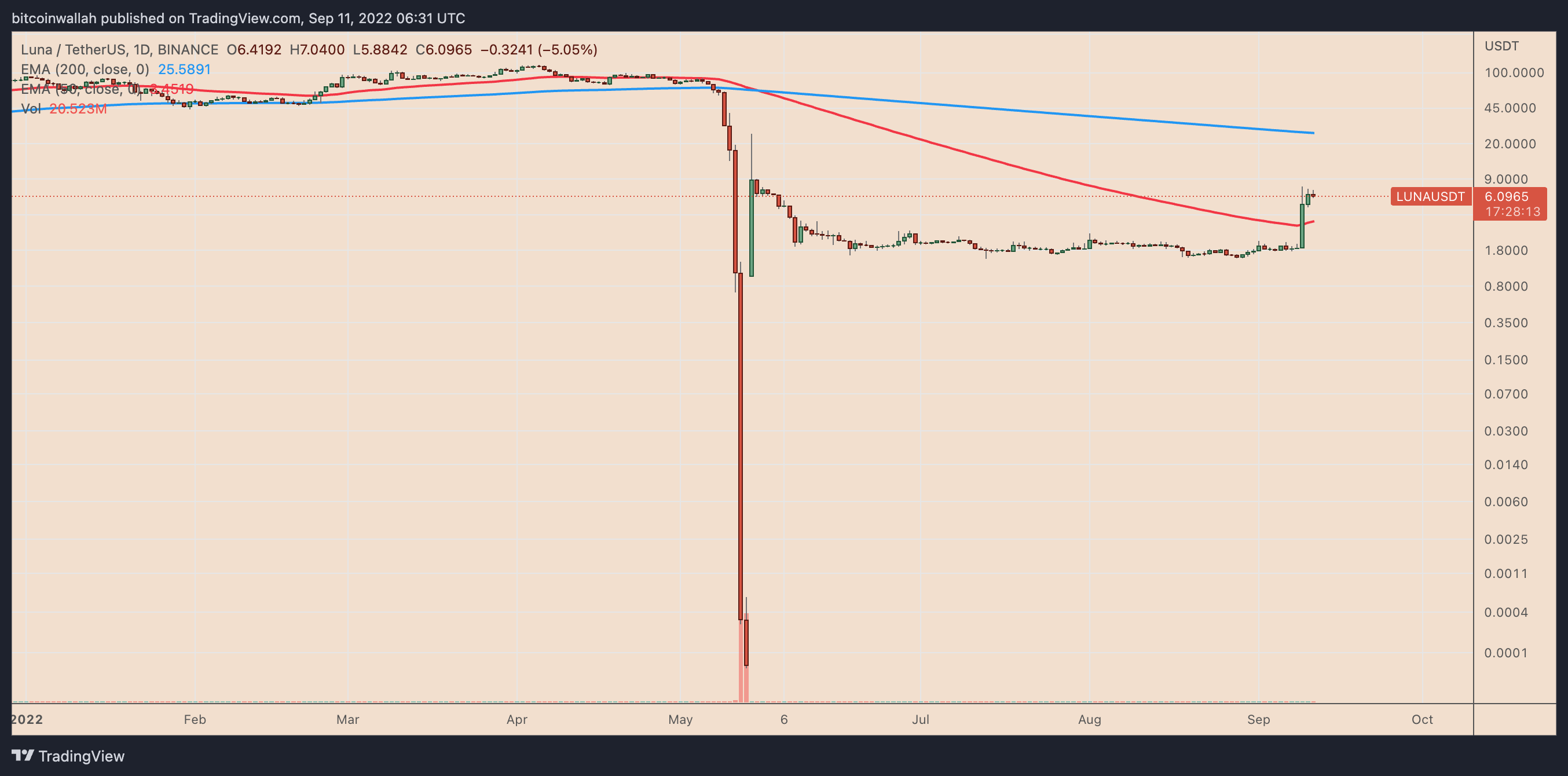 After crashing to nearly zero in May, LUNA is now trading for around $6, a whopping 17,559,000% price rally in less than four months when measured from its lowest level.