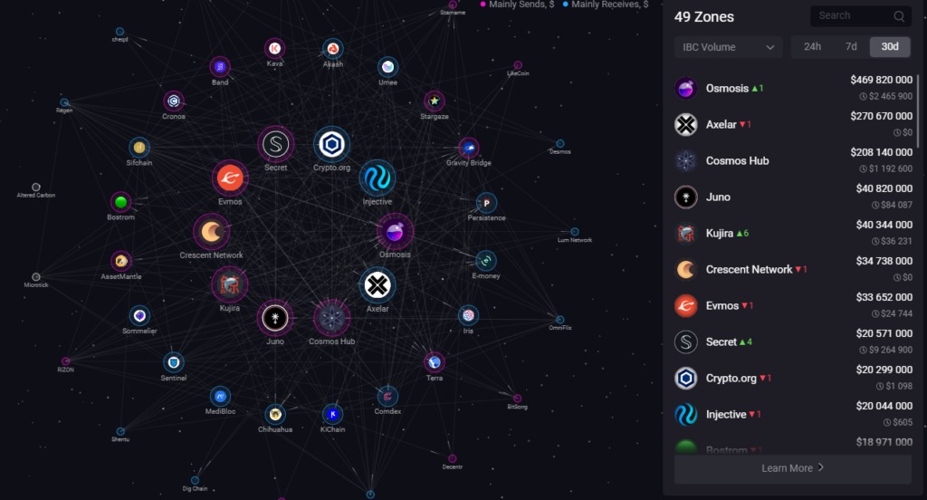 Users of the Osmosis DEX can make use of 89 cross-chain bridges across 45 blockchains on Osmosis. That means one can swap in and out of connected tokens in a noncustodial manner, as well as earn swap fees for providing liquidity.